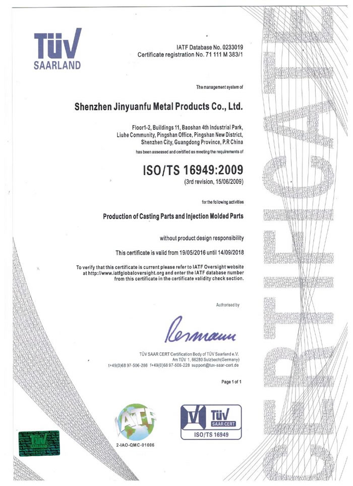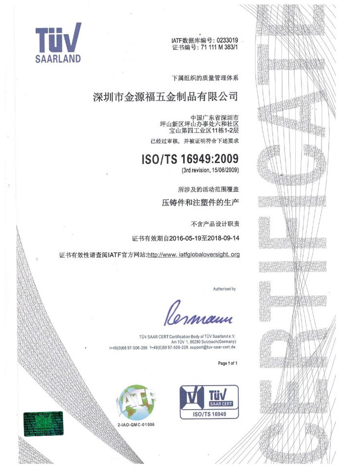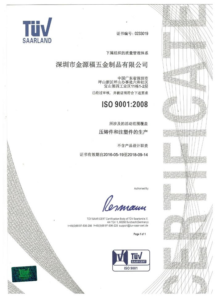 深圳市金源福五金制品有限公司成立于2003年。公司擁有8000多平方米生產(chǎn)廠地、開發(fā)與管理精英人才、技術專業(yè)、設備精良、交通便利、服務周全、具體設計、開發(fā)、制模、出樣、生產(chǎn)到成品出貨一體化模式生產(chǎn)廠家。已通過ISO9001:2008ISO1440/TS16949:2009國際質(zhì)量體系認證。專業(yè)生產(chǎn)鋅合金壓鑄、鋁合金壓鑄產(chǎn)品、汽車配件、汽車后視鏡支架、車載導航散熱器、LED散熱器、LED燈罩、數(shù)碼電子五金結(jié)構件、家具五金裝飾件、標牌(LOGO)等五金壓鑄產(chǎn)品。